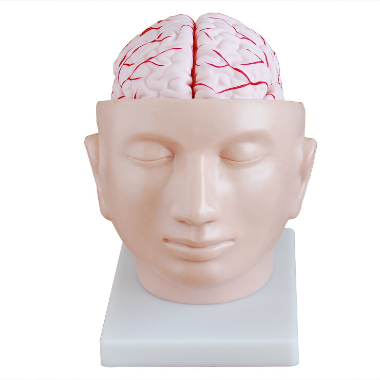 这款模型显示颅内的脑结构,颅基之上头部可平行打开。脑模型可中分以显示脑动脉和可拆卸脑底动脉。两半都可分解为: 前顶叶、颞枕叶、脑干、小脑置于基架上。